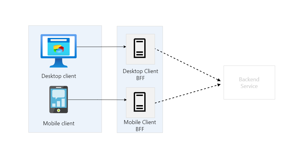 不同前端,比如桌面端和移动端,可能对后端的需求不同,为了保持兼容性和处理差异,维护单一的后端的工作量会很大。因此可以增加一层,称为 BFF,它针对不同的前端,提供不同的后端服务。